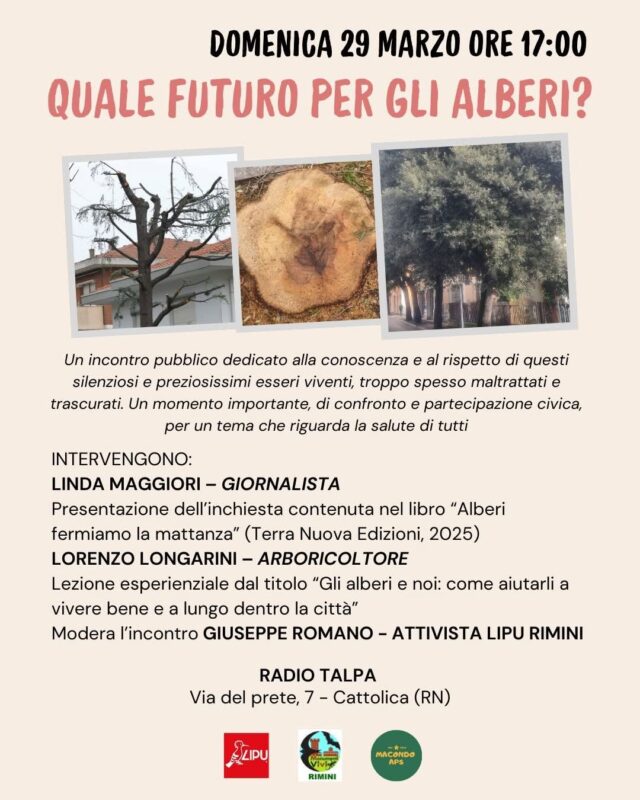 Linda Maggiori, autrice del libro-inchiesta “Alberi: fermiamo la mattanza” (Terra Nuova edizioni), presenta il libro il 29 marzo alle 17.30 a Cattolica (Rimini). L’evento si tiene alla sede di Radio Talpa, via del Prete 7.