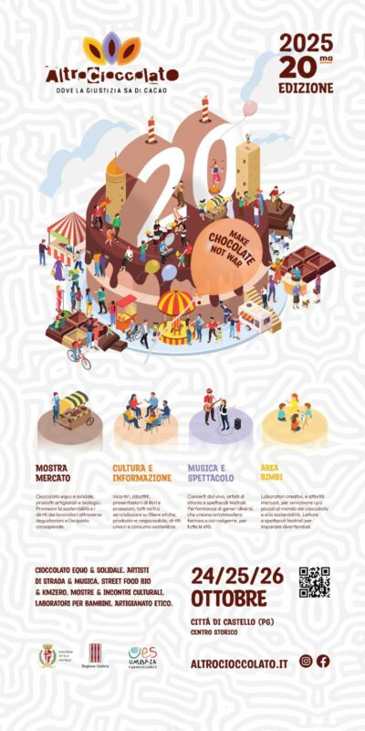 Tre giorni di eventi, laboratori e incontri dedicati al cioccolato equo e solidale, ai diritti umani e alla giustizia globale. Un’edizione speciale per celebrare vent’anni di impegno con lo slogan: Make Chocolate, Not War.