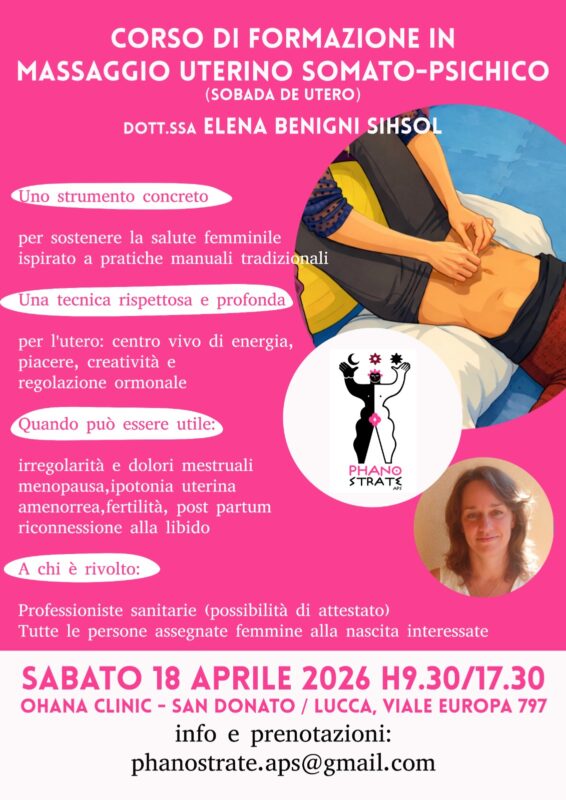 La dottoressa Elena Benigni, autrice di “Medicina placentare. Una rivoluzione culturale e scientifica per una cura profonda dell’essere umano”, tiene un corso di formazione sul massaggio uterino somato-psichico il 19 aprile dalle 9.30 alle 17.30 alla Ohana Clinic di San Donato (Lucca).