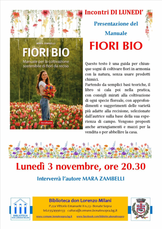Lunedì 3 novembre alle 20.30 Mara Zambelli presenta il suo libro “Fiori bio. Manuale per la coltivazione sostenibile di fiori da reciso” (Terra Nuova edizioni). L’evento si tiene alla biblioteca Don Lorenzo Milani, in via Vittorio Emanuele II n. 23 a Bonate Sopra (Bergamo).
