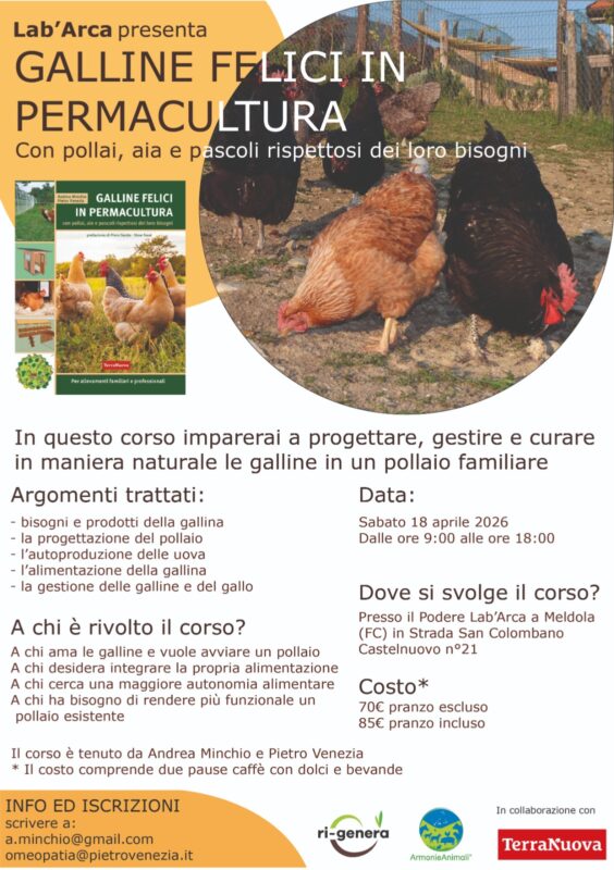 Sabato 18 aprile, dalle 9 alle 18 al Podere Lab’Arca a Meldola si tiene il corso “Galline felici in permacultura” per imparare a progettare correttamente, gestire e curare in maniera naturale un pollaio avicolo familiare.