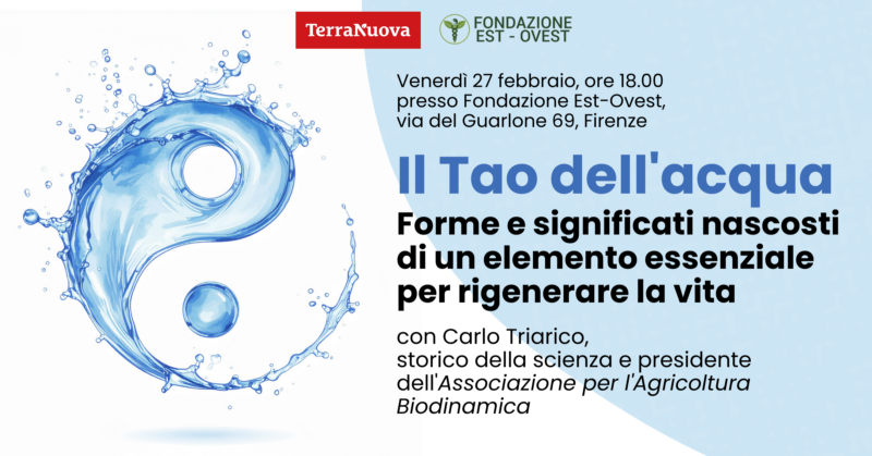 Venerdì 27 febbraio alle ore 18 Carlo Triarico, presidente dell’Associazione per l’Agricoltura Biodinamica, incontra il pubblico sul tema “Il Tao dell’acqua. Forme e significati nascosti di un elemento essenziale per rigenerare la vita”. L’evento si tiene presso la Fondazione Est-Ovest, via del Guarlone 69, a Firenze.