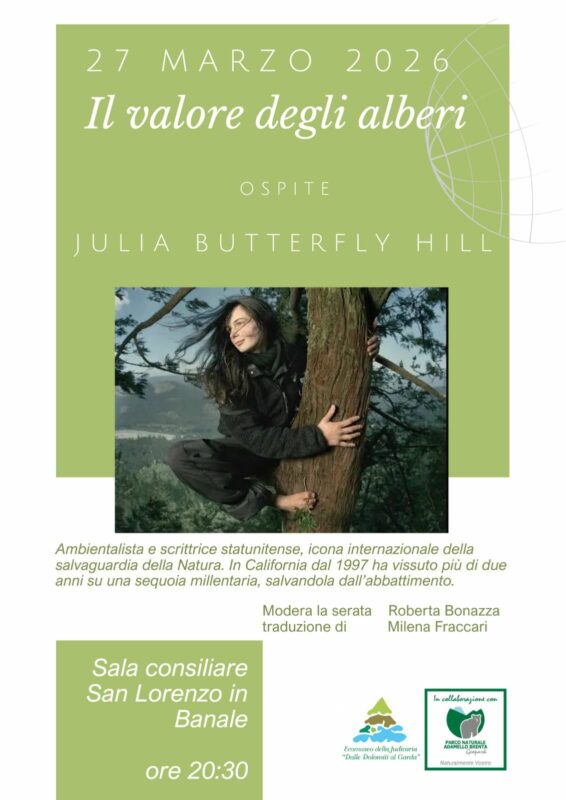 Il 27 marzo Julia Butterfly Hill sarà ospite alla sala consigliare (piazza delle Sette Ville 4) di San Lorenzo in Banale (Trento) per l’incontro pubblico “Il valore degli alberi” (ore 20.30). Julia ha scritto il bellissimo libro “La ragazza sull’albero” (Terra Nuova edizioni), in cui ha raccontato la sua storia, che ha fatto il giro del mondo. Il 10 dicembre 1997, a 23 anni, si arrampicò in cima a una sequoia per protestare contro l’abbattimento di una foresta negli Stati Uniti. Ci ha trascorso due anni e ha salvato la foresta. Oggi, Julia continua a rappresentare un simbolo per il movimento ambientalista mondiale.