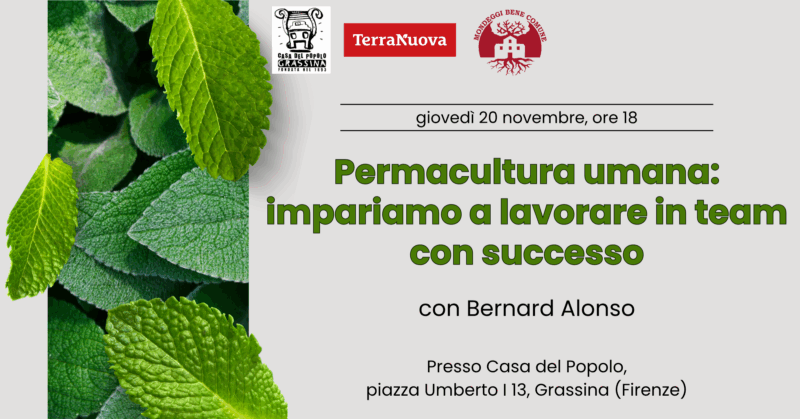 Giovedì 20 novembre alle ore 18 sarà a Grassina (Firenze), presso la Casa del Popolo, per l’incontro dal titolo “Permacultura umana: impariamo a lavorare in team con successo” (piazza Umberto I 13; ingresso libero e gratuito)