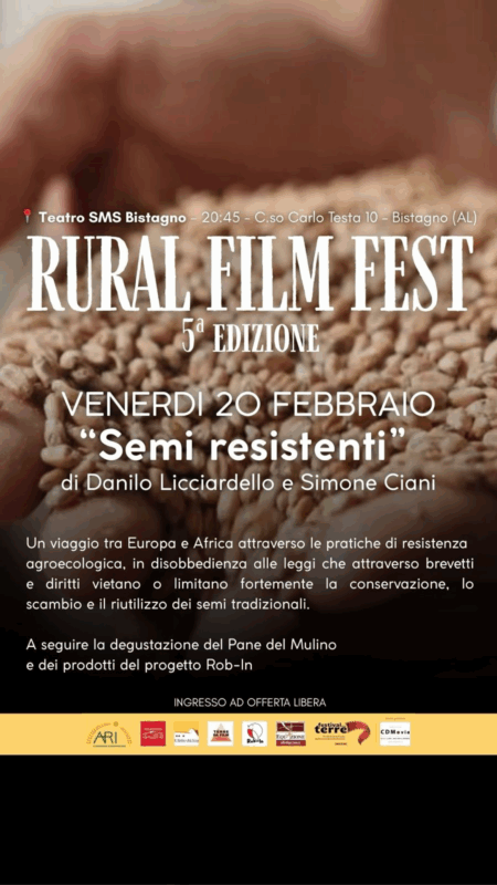 Venerdì 20 febbraio alle ore 20.45 al Teatro SMS in corso Carlo Testa 10 a Bistagno (Alessandria) si proietta il documentario “Semi resistenti” su iniziativa dell’Associazione Rurale Italiana, nell’ambito del Rural Film Festival. Ingresso a offerta libera.