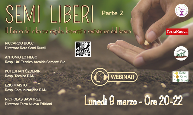 Lunedì 9 marzo dalle ore 20.00 alle 22.00 webinar gratuito dal titolo “Semi liberi. Seconda parte. Il futuro del cibo tra regole, brevetti e resistenze dal basso”, organizzato da Ran in collaborazione con Terra Nuova e Arcoiris Sementi Bio. Partecipano: Kutluhan Ozdemir, responsabile tecnico di Ran; Riccardo Bocci, direttore della Rete Semi Rurali; Antonio Lo Fiego, responsabile dell’ufficio tecnico di Arcoiris; Ezio Maisto, responsabile della comunicazione di Ran; Nicholas Bawtree, direttore editoriale di Terra Nuova.