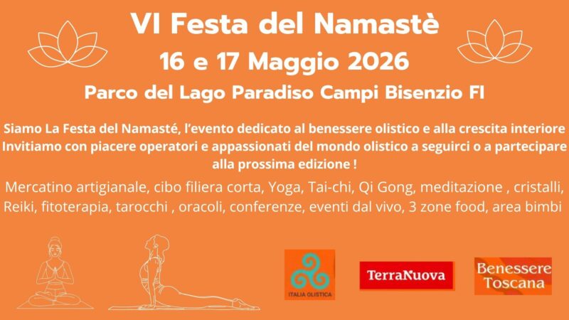 Il 16 e 17 maggio al parco del lago Paradiso a Campi Bisenzio (Firenze) si tiene la sesta edizione della festa del Namastè, fiera del benessere olistico e della crescita interiore, con mercatino, meditazionim sedute di reiki, yoga e tanto altro.