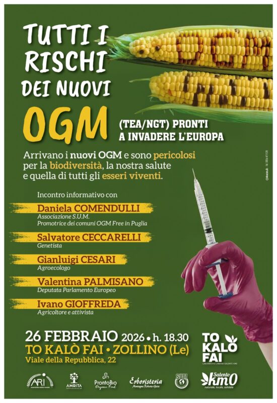 Il 26 febbraio alle 18.30 al To Kalò Fai di Zollino (Lecce), viale della Repubblica 22, incontro pubblico dal titolo “Tutti i rischi dei nuovi ogm”, promosso dall’Associazione Rurale Italiana in collaborazione con Amrita, ProntoBio, Erboristeria Montagna, Sum e Salento Km0.