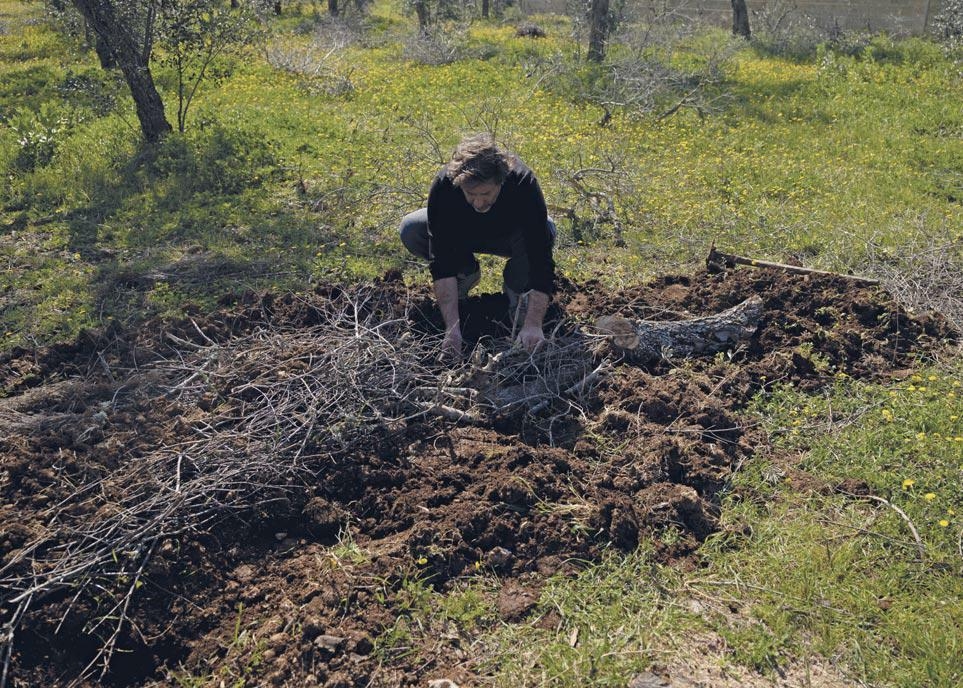 Io provo a imitare la natura, operando in modo rigenerativo. Costruisco colline vegetali, scavando solchi e interrando prima i tronchi più grandi fino ai rami più sottili, rimettendo in circolo la materia organica. Alcuni dei rami che ho dovuto tagliare li sto usando per rinfoltire e sostenere le fragili chiome che rimangono. Con il materiale secco creo barriere che riparano dai venti e costruisco delle strutture intrecciate come supporti per la crescita dei nuovi alberi che pianto: fichi, gelsi, pistacchi, querce, melograni e ulivi di varietà più resistenti al batterio. Come in una grande scultura vivente.