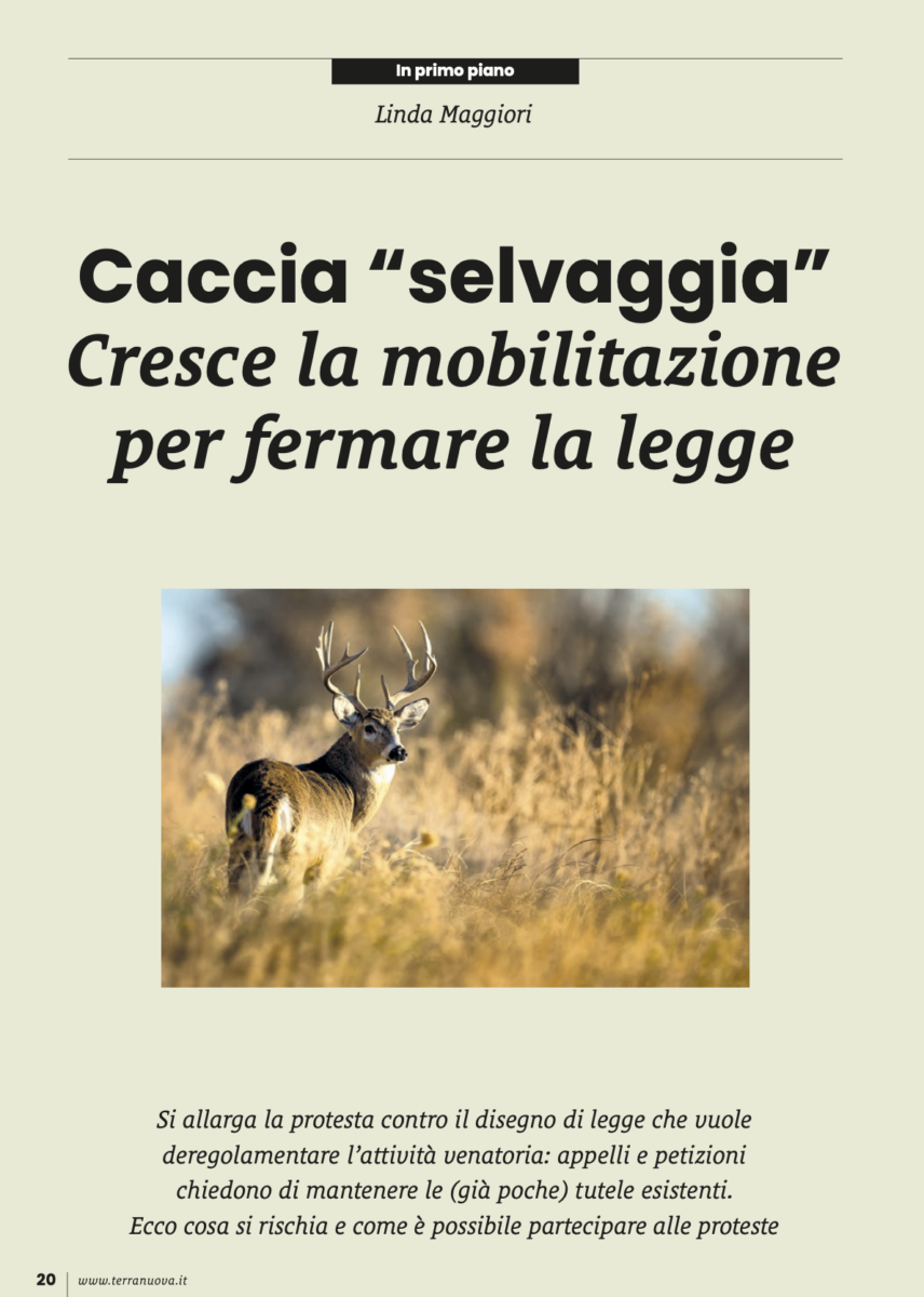 Leggo l’articolo di Linda Maggiori sulla mobilitazione della società civile e delle associazioni contro la deregolamentazione della caccia.